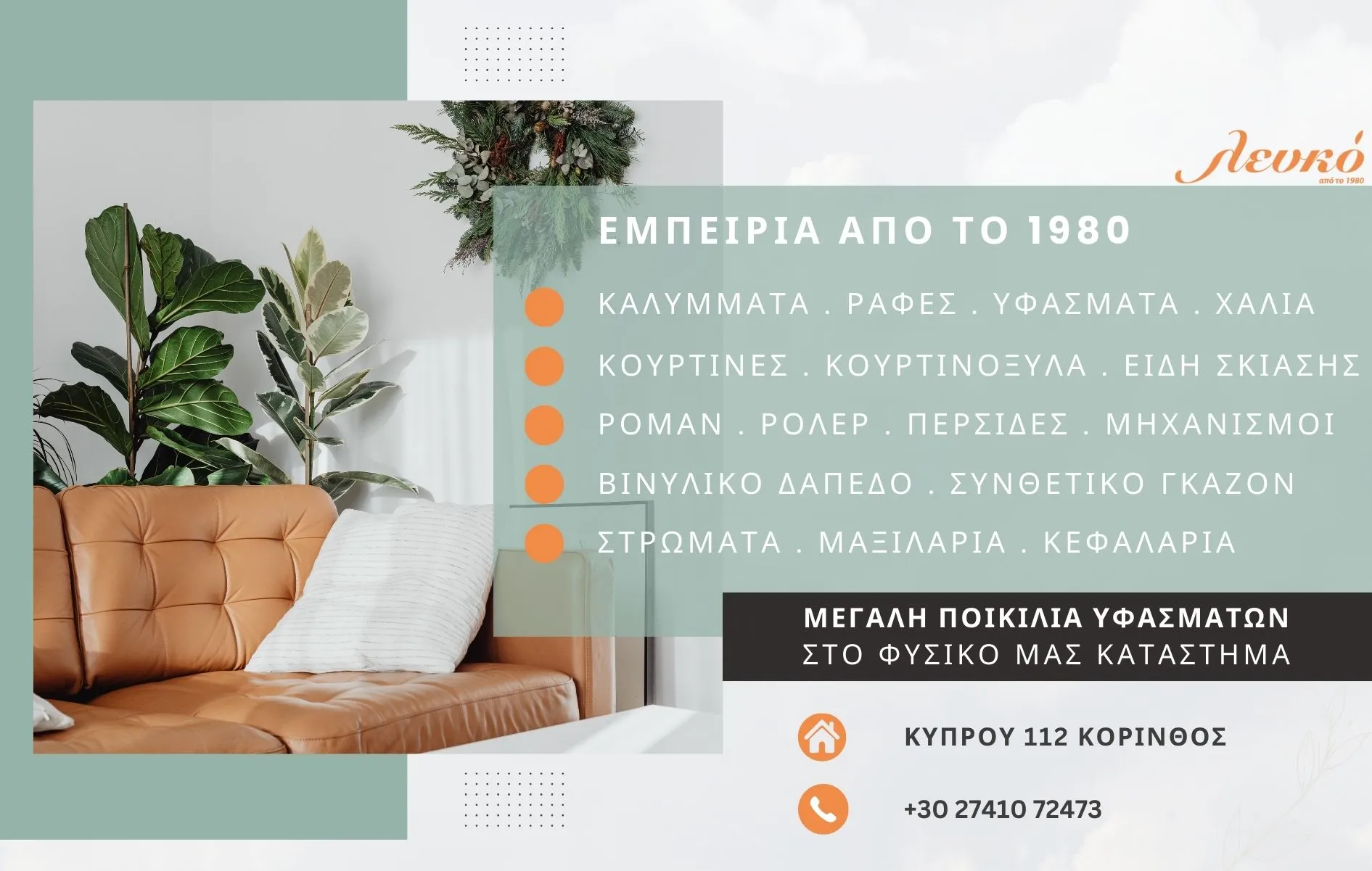Διανύοντας από το 1980 στην Κόρινθο μακρά πορεία στον τομέα του επαγγελματικού και οικιακού εξοπλισμού, αποκτήσαμε εμπειρία, τεχνογνωσία και κορυφαίες ικανότητες στις κατασκευές, τοποθετήσεις και ραφές υφασμάτων κουρτίνας, ειδών σκίασης, ταπετσαρίας σαλονιού και χαλιών. Με το ηλεκτρονικό μας κατάστημα παρέχουμε πανελλαδικά εκτενή συλλογή με λευκά είδη, χαλιά, κλινοσκεπάσματα, δάπεδα βινυλίου, μαξιλάρια, ανατομικά στρώματα και προϊόντα που θα καλύψουν κάθε σας ανάγκη για το σπίτι, τον κήπο, το γραφείο ή το τουριστικό κατάλυμα. Το ΛΕΥΚΟ είναι όνομα εγγύησης για την ποιότητα, την ανθεκτικότητα και την αξιοπιστία, με πελάτες ετών χονδρικής και λιανικής στην Ελλάδα.