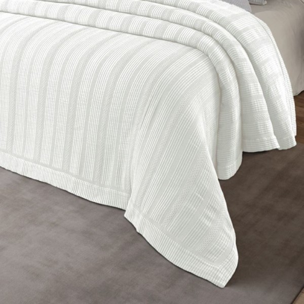 Evelyn is a quality blanket with a distinctive design made of 100% cotton stonewash by Liolios Home brand. Ideal for your bedroom, for the warmer months of Spring and Summer. Elegant design and white color that fits any decor. In super double size.