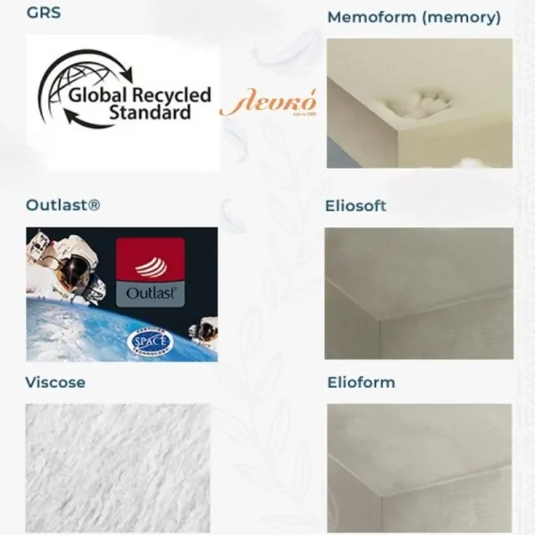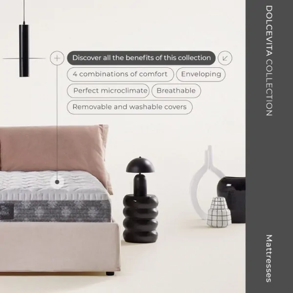 The different combinations of layers in Memoform and Eliosoft guarantee different comfort levels that can be easily combined by removing the cover and choosing the preferred solution. Snug, anatomical Memoform avoids pressure points and stimulates blood circulation. The cover, made of soft viscose and temperature-regulating Outlast®, which absorbs excess heat and releases it when needed has obtained the GRS (Global Recycle Standard) certification. Medium-Soft/Medium-Firm comfort.