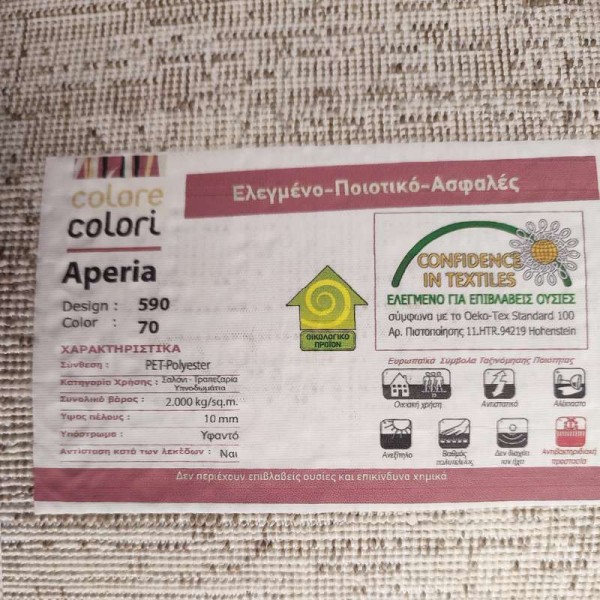 CERTIFICATION-SAFETY FOR HEALTH: Aperia have been tested for their ecological orientation as well as for the absence of substances harmful to health in accordance with the requirements of the German institute Oeko-Tex Standard 100 and have been awarded with the certification 11.HTR.94219 from the Hohenstein Institute. When you get this carpet you enjoy the combined benefits of great aesthetics and safety for your living environment.