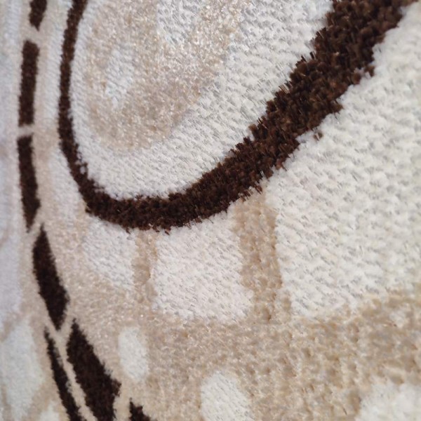 Stock carpet — last piece — in shades of light beige, vanilla, and brown with a geometric spiral design. A modern synthetic machine-made carpet from the Senta series, tested for harmful substances, environmentally friendly, and certified with OEKO-Tex Standard 100. It is an ecological product, antistatic, hypoallergenic, antimicrobial, easy to clean without leaving fluff or hairs, and resistant to stains