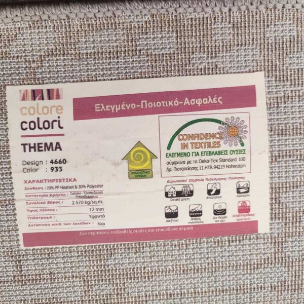 CERTIFICATION-SAFETY FOR HEALTH: Thema have been tested for their ecological orientation as well as for the absence of substances harmful to health in accordance with the requirements of the German institute Oeko-Tex Standard 100 and have been awarded with the certification 11.HTR.94219 from the Hohenstein Institute. When you get this carpet you enjoy the combined benefits of great aesthetics and safety for your living environment.