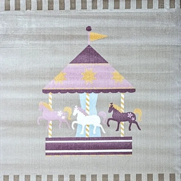 A carpet with dimensions 160X230cm on sale, ideal for the children room. Color: off-white gray with brown stripes around the perimeter and in the center a pink purple carousel design with horses