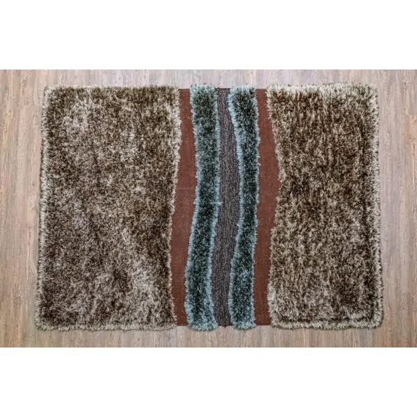 Handmade silk and wool rug from the Makis Tselios collection to ideally decorate the living room or bedroom. With warm shades such as fluffy brown-olive with a few red and blue stripes in the center. Unique piece of STOCK rug measuring 160X230cm with the brand name MAKIS TSELIOS.