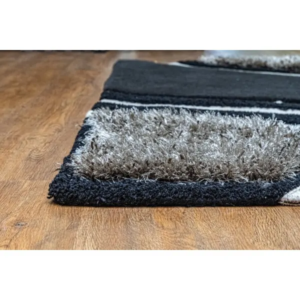 Handmade silk and wool rug from the Makis Tselios collection to ideally decorate the living room or bedroom. With classic shades such as black background with 4 irregular squares of gray and black tassels. Unique piece of STOCK rug measuring 160X230cm with the brand name MAKIS TSELIOS.