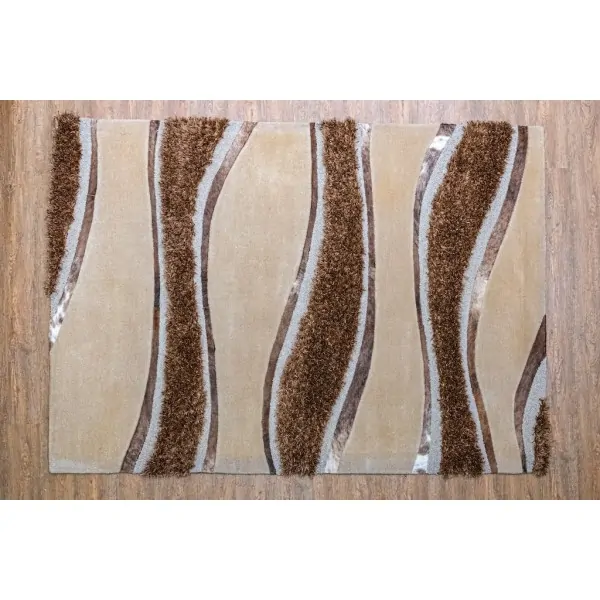 Handmade silk and wool rug from the Makis Tselios collection to ideally decorate the living room or bedroom. With warm shades such as brown and cream with a striped fluffy pattern reminiscent of a zebra. Unique piece of STOCK rug measuring 160X230cm with the brand name MAKIS TSELIOS.