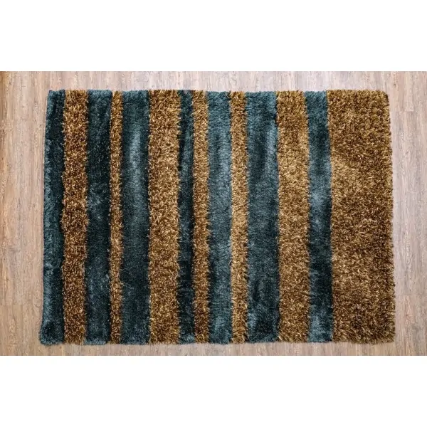 Handmade artificial silk carpet from Makis Tselios collection to ideally decorate the living room or bedroom. With warm shades such as brown with wide asymmetrical blue stripes. Unique piece STOCK carpet dimensions 160X230cm with the brand name MAKIS TSELIOS.