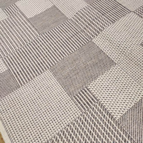 Summer synthetic rug with wicker weave in shades of beige that form squares, for boho decoration, without fringes. Synthetic wicker rugs fit all rooms, can be used in kitchens and dining rooms, are easy to clean and are also called 4 seasons.