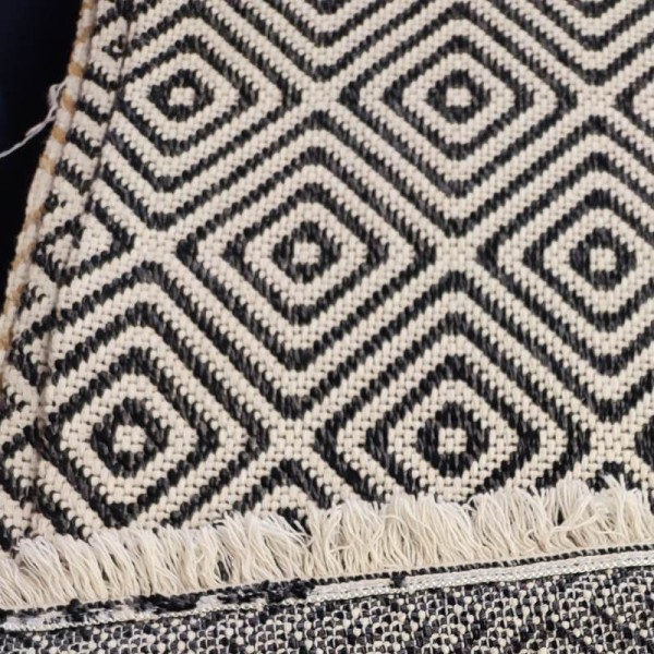 Woven rug with black parallel geometric patterns and white fringe for boho summer decor. Synthetic woven rugs are suitable for all rooms. They can be used in kitchens and dining rooms, they are easy to clean and are also called 4 seasons.