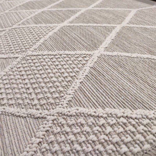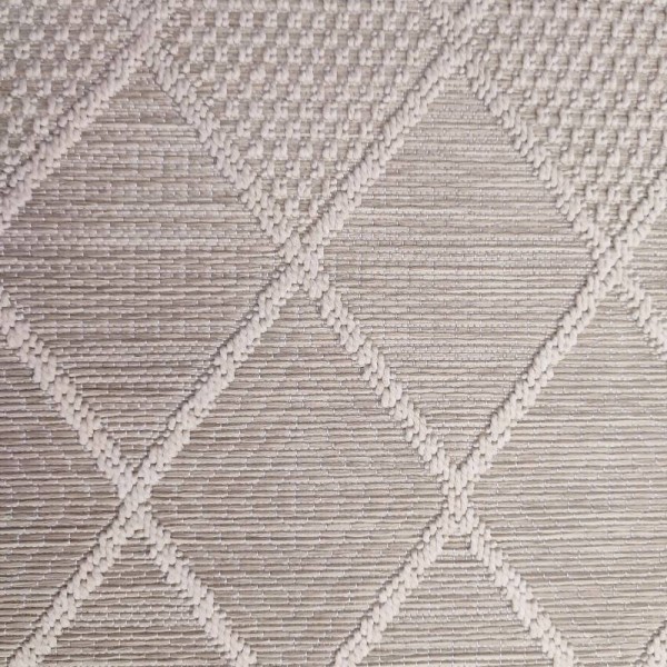 Summer synthetic rug with wicker weave in shades of beige and ecru that form large embossed square diamonds, for boho decoration, without fringes. Synthetic wicker rugs fit all rooms, can be used in kitchens and dining rooms, are easy to clean and are also called 4 seasons. Dimensions 160X230cm, only 48 euros!