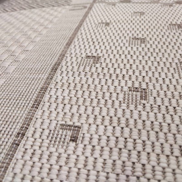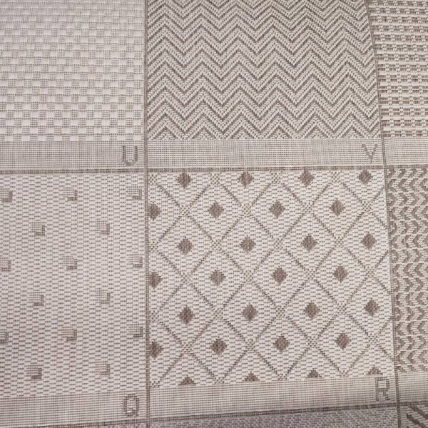 Summer synthetic rug with wicker weave in shades of beige with large squares that have different design and letters, for boho decoration, without fringes. Synthetic wicker rugs fit all rooms, can be used in kitchens and dining rooms, are easy to clean and are also called 4 seasons. Dimensions 160X230cm, only 48 euros!
