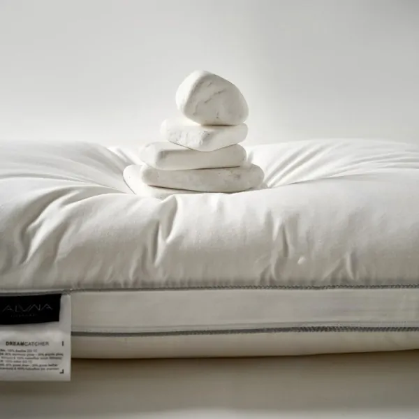 The airy Dreamcatcher goose feather pillow by LaLuna is designed with 3 chambers, a special anti-allergic treatment, and a perimeter gusset for added comfort. Measuring 50x70cm, it is medium in height and medium in firmness, ideal for those who prefer to sleep on their back or side. The surface that comes into contact with the skin is made of 100% cotton percale with a 233-thread count, down-proof and quilted