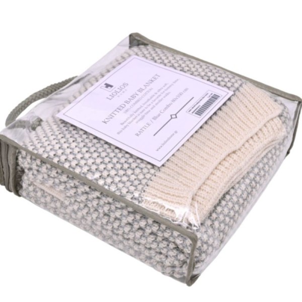 Απαλή κουβέρτα για μωράκι από 100% βαμβάκι όμορφα πλεγμένη με χρώματα μπεζ και μπλε! Μία ιδανική και διαχρονική επιλογή για το βρεφικό δωμάτιο ή σαν κουβερτάκι αγκαλιάς και βόλτας! Πλένεται στους 40 βαθμούς.