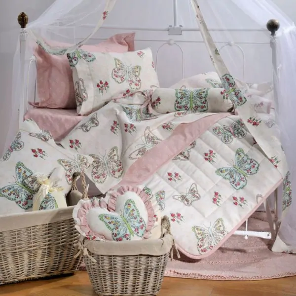 Βρεφικό πάπλωμα κούνιας από την ποιοτική εταιρεία Down Town, για να κρατάτε ζεστό το μωράκι σας. Το εξωτερικό του ύφασμα από βαμβάκι σατέν πενιέ 220 κλωστών το καθιστά ιδιαίτερα απαλό και ασφαλές για την υγεία με πιστοποίηση πιστοποίηση oekotex standard 100. Το χαριτωμένο σχέδιο με πεταλούδες θα γίνει το αγαπημένο για τους γονείς και το μωράκι!