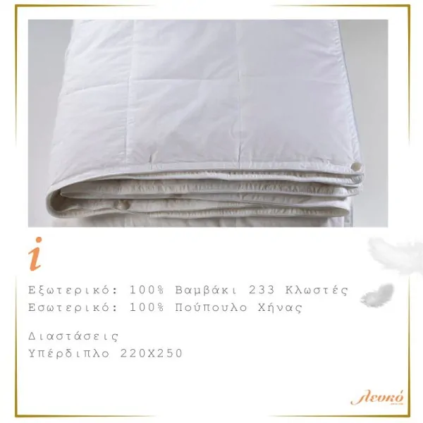 Πουπουλένιο πάπλωμα της ποιοτικής εταιρείας Down Town που ζεστάινει ιδανικά αναλόγως περιόδου, καθώς αποτελείται από 2 ξεχωριστά παπλώματα, διαφορετικού βάρους και ενώνονται με κουμπιά για πιο ζεστό ή πιο κρύο κλίμα. Διαθέσιμο σε διαστάσεις υπέρδιπλου 220Χ250cm.