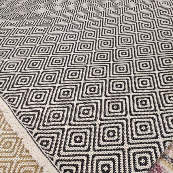 Χαλί με ψάθινη πλέξη με μαύρα παράλληλα γεωμετρικά μοτίβα και λευκό κρόσι για μπόχο καλοκαιρινή διακόσμηση. Τα συνθετικά ψάθινα χαλιά ταιριάζουν σε όλα τα δωμάτια. Μπορούν να χρησιμοποιηθούν στις κουζίνες και στις τραπεζαρίες, είναι εύκολα στο καθάρισμα και αποκαλούνται επίσης 4 εποχών.