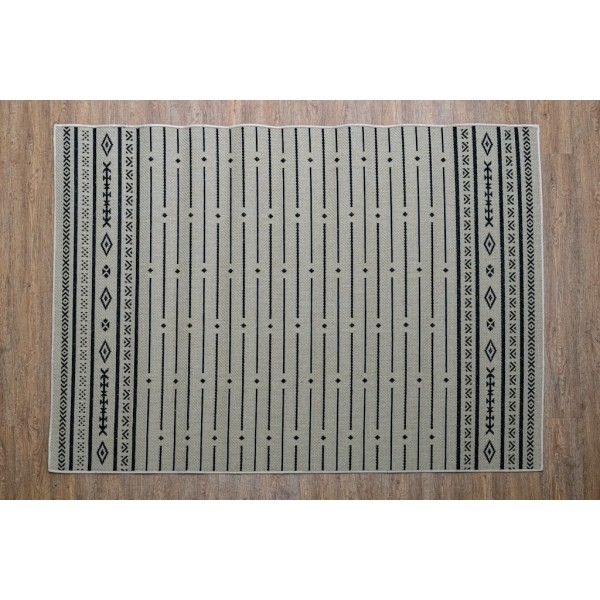 Καλοκαιρινό χαλί συνθετικό με ψάθινη πλέξη στις αποχρώσεις του μπεζ και του μαύρου με παράλληλες γραμμές, για μπόχο διακόσμηση, χωρίς κρόσια. Τα συνθετικά ψάθινα χαλιά ταιριάζουν σε όλα τα δωμάτια, μπορούν να χρησιμοποιηθούν στις κουζίνες και στις τραπεζαρίες, είναι εύκολα στο καθάρισμα και αποκαλούνται συνήθως χαλιά 4 εποχών. Διάστασης 160Χ230cm, μόνο με 48 ευρώ!