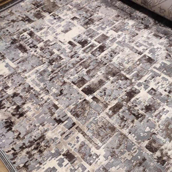 Μοντέρνο χαλί σε προσφορά για κάθε δωμάτιο με παχύ πέλος ανάγλυφο, καφέ γκρι και κρεμ αφηρημένο σχέδιο patchwork, έτοιμο κομμένο σε διάσταση 145x230cm.