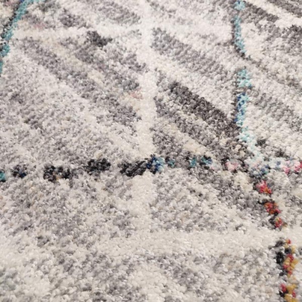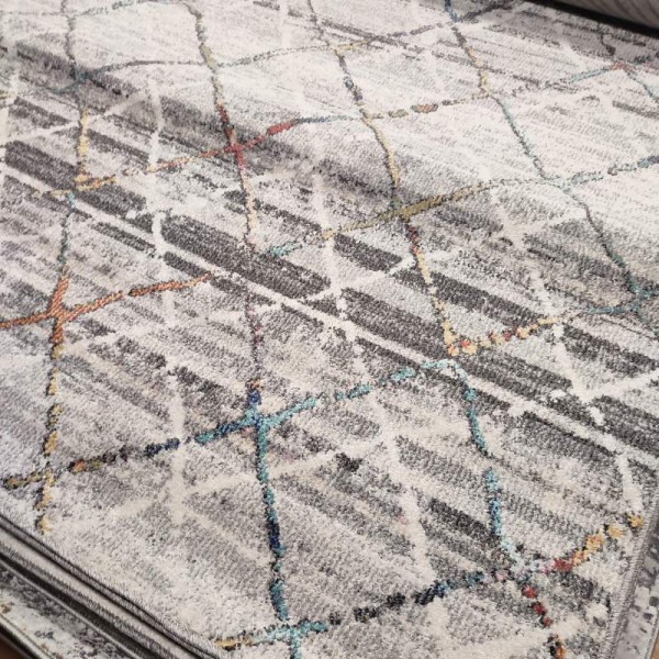 Μοντέρνο χαλί σε προσφορά για κάθε δωμάτιο μίνιμαλ με γκρι ασύμμετρες χιαστί γραμμές και πολύχρωμα σημεία, χωρίς κρόσσι έτοιμο κομμένο σε διάσταση 160X230cm.