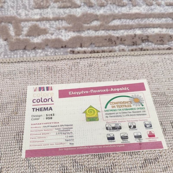 Τα Thema έχουν ελεγχθεί για τον οικολογικό προσανατολισμό τους καθώς και για την μη ύπαρξη επιβλαβών προς την υγεία ουσιών σύμφωνα με τις απαιτήσεις του Γερμανικού ινστιτούτου Oeko-Tex Standard 100 και έχουν βραβευθεί με την πιστοποίηση 11.ΗΤΡ.94219 από το ινστιτούτο Hohenstein. Όταν αποκτήσετε αυτό το χαλί απολαμβάνετε τα συνδυαστικά πλεονεκτήματα μιας υπέροχης αισθητικής και της ασφάλειας στο περιβάλλον διαβίωσης.