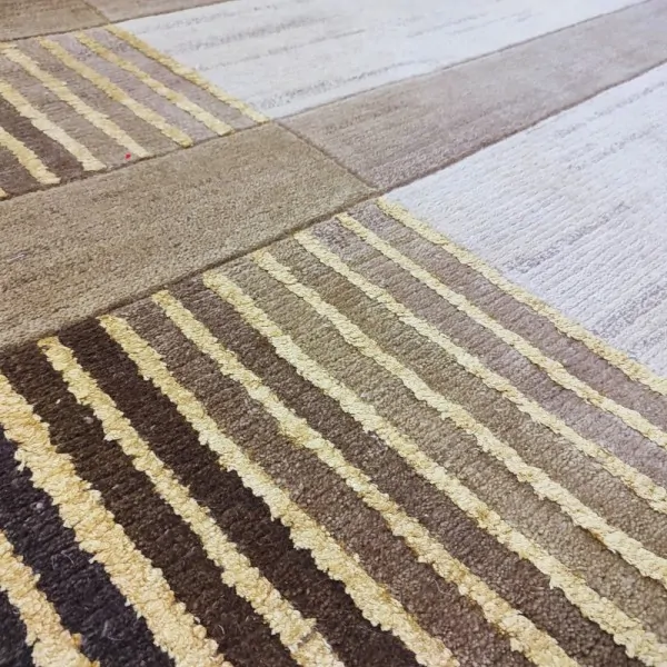 Χαλί ΣΤΟΚ, μοναδικό τεμάχιο στο κατάστημά μας, από τον εξαιρετικής ποιότητας οίκο Pierre Cardin. Το χαλί αυτό είναι χειροποίητο από μαλλί Νέας Ζηλανδίας και λεπτομέρειες από βισκόζη. Οι αποχρώσεις του χαλιού το καθιστούν ταιριαστό σε κάθε δωμάτιο καθώς είναι μπεζ, γκρι και καφέ. Διαθέτει σχήμα με ακανόνιστες ρίγες. Με διαστάσεις 160Χ230cm