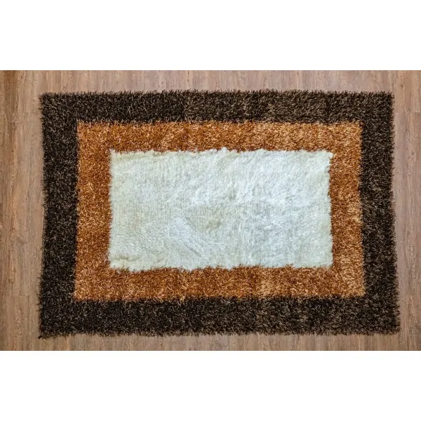 Χεροποίητο χαλί τελευταίο τεμάχιο από την Ινδία από τεχνητό μετάξι για υπέροχη και πλούσια υφή και Χρώμα: γεωμετρικό χαλί με ορθογώνιο παραλληλόγραμμο, λευκό πάγου με περίγραμμα καμηλό καφέ και δεύτερο περίγραμμα σκούρο καφέ. Διαστάσεις 160Χ230cm, ιδανικό για κάθε σαλόνι.