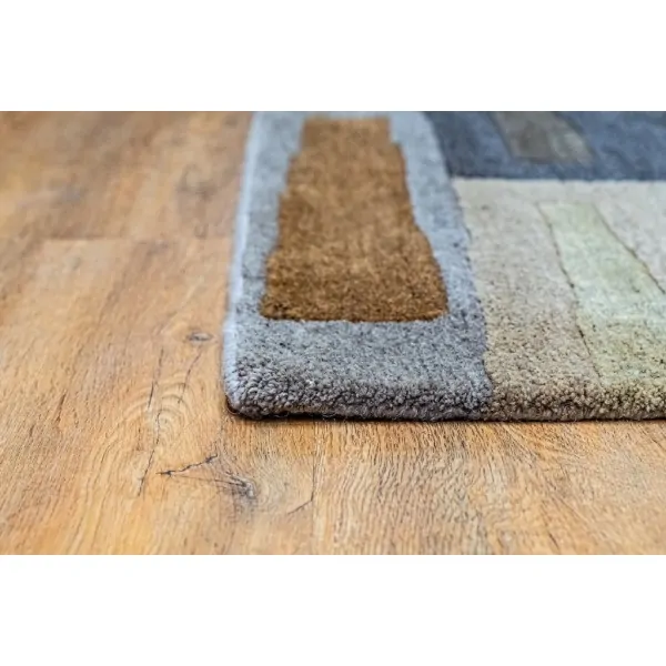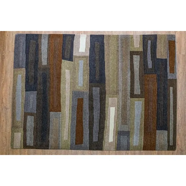 Χειροποίητο μάλλινο χαλί του οίκου BRINK & CAMPMAN με χρώματα γκρι καφέ, μπλε, λευκό και μπεζ σε σχέδιο patchwork σε μοναδική προσφορά καθώς πρόκειται για το τελευταίο τεμάχιο της συλλογής μας.
